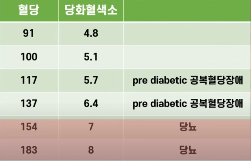 공복혈당은 100이상, 당화혈색소 5.7 이상이면 공복혈당에 장애가 있다고 볼 수 있고 당화혈색소 6.5 이상일 경우 당뇨환자로 분류합니다.