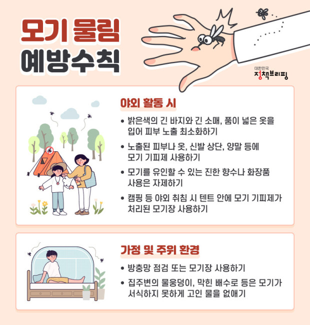말라리아와 뎅기열은 예방백신이 없기 때문에 모기에 물리지 않도록 조심하는 것이 가장 중요합니다. 말라리아 유행 지역으로 여행을 간다면 모기에 물리지 않도록 긴소매 옷으로 피부를 가리고 밝은 색 옷을 착용하는 것이 도움이 됩니다. 모기 기피제를 필수로 사용합니다.