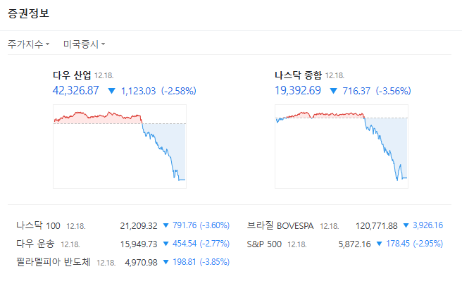 2024. 12. 18. 뉴욕 증시가 3% 전후 내림세를 나타내며 지난 8월 이후 가장 큰 낙폭을 기록, 이는 12월 FOMC 회의 결과때문이라고 합니다. 미국 연준은 금리 인하를 단행했지만 내년도 금리 인하 전망치를 당초보다 보수적으로 책정했습니다.