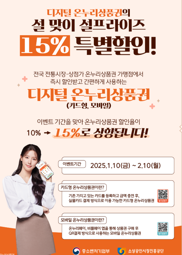 1월 10일부터 2월 10일까지 온누리상품권을 15% 할인하여 판매합니다. 설명절을 맞아 카드형과 모바일형 할인율을 10%에서 15%로 높였습니다.