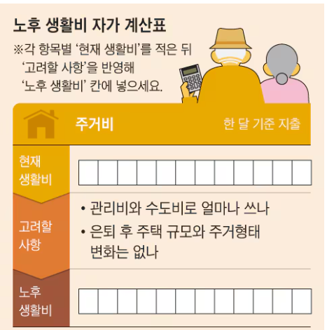 다음은 조선일보에 나온 노후생활비 자가 계산표이니 한번씩 계산해보면 조금 더 구체적으로 계산할 수 있습니다.